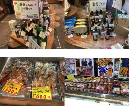能登の海産物の能登かき・加能ガニ、また能登牛や能登産珍味(干しあわび・干しのどぐろ・干しふぐ)、さらに加工食品の能登牛ご飯だれ、にんにく肉味噌、お酒類ののとワイン、能登の日本酒など能登ブランドが盛りだくさん。またイートインスペースもあり、ビールなどといっしょにその場で食べられるサービスも有り、さながら高級縁日のようです。