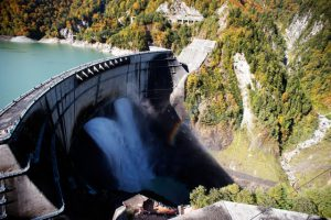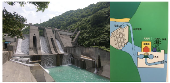 そして黒部川には12の水力発電所があります。これらは黒部川の水が落ちる勢いを利用して水車を回し電力を産みます。